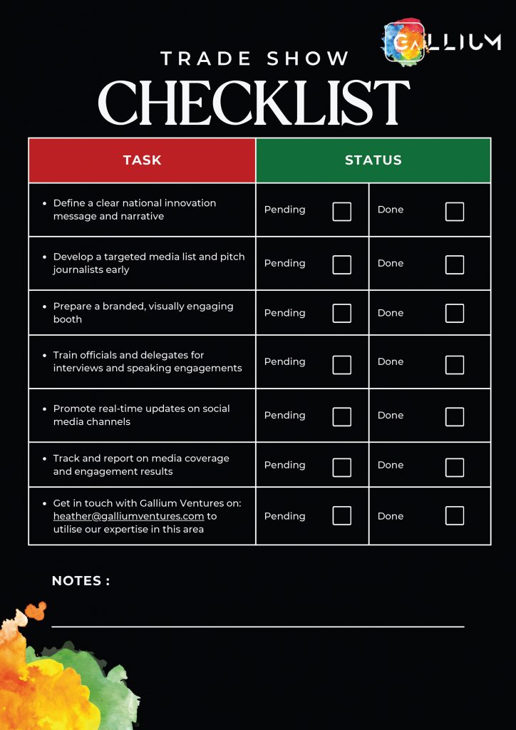 To recap, trade shows are key to building international relationships with different stakeholders from across the globe, and to showcase your country’s capabilities in any industry space. However, they can be very expensive and disappointing if not utilised properly. Below is a checklist of the key things to keep in mind for success: